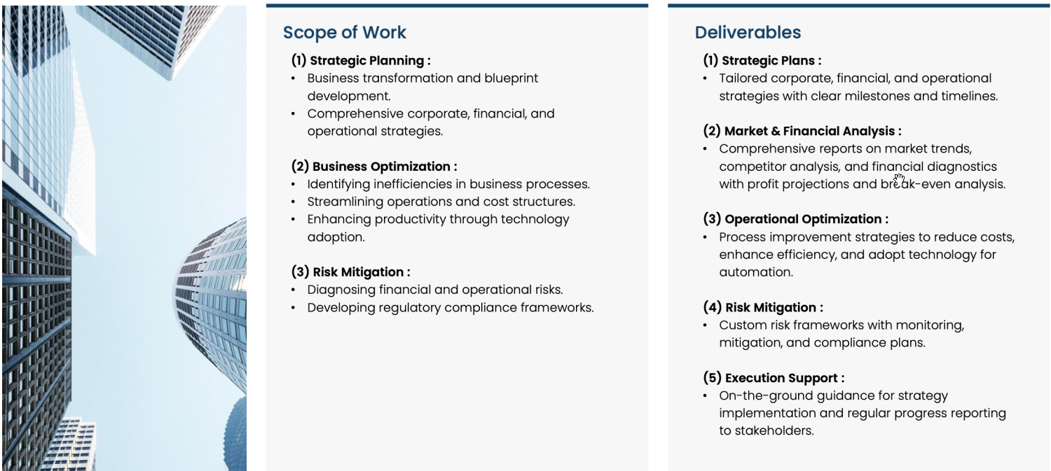 การเปลี่ยนแปลงและพัฒนาองค์กรสู่ความยั่งยืน บริการปรับปรุงและเปลี่ยนแปลงโครงสร้างธุรกิจ กระบวนการทำงาน และวัฒนธรรมองค์กร เพื่อเพิ่มประสิทธิภาพและความสามารถในการแข่งขัน พร้อมการพัฒนาที่เน้นความรับผิดชอบต่อสังคม